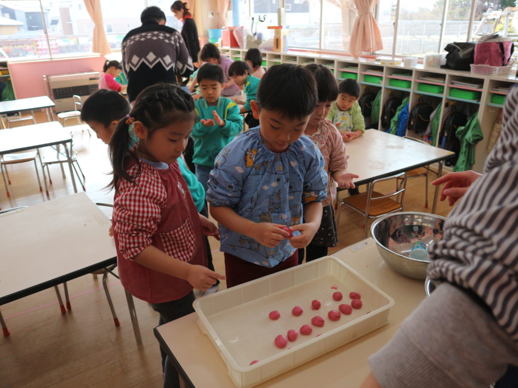 自分たちでおだんごを丸めて、色の意味やだんご刺しを行う由来を知ることができた子どもたち!